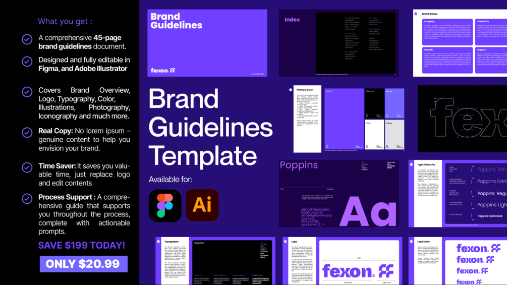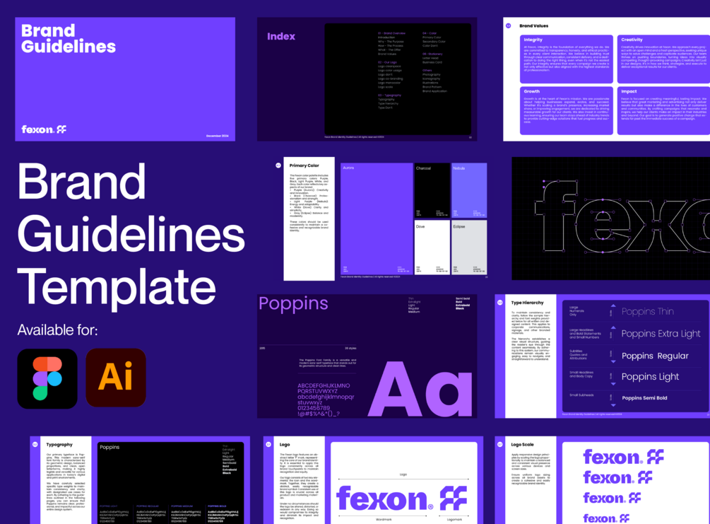 This Brand Guidelines set includes 45 fully customizable design templates available in Figma and Adobe Illustrator. Tailor the templates to fit your brand or your clients' needs by simply updating the business name, logo, and concept wording.